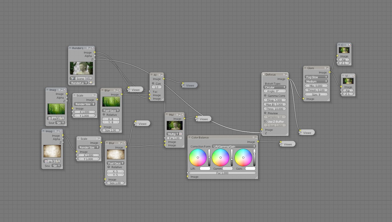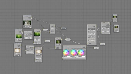 Ovšem toto není všechno, co bychom měli o renderu vědět. Každý člověk má jiný vkus a jinou představu o tom, jak by měla jeho scéna vypadat. Nicméně se ještě pokusím nastínit možnosti post-úprav samotného vypočítaného obrázku. Stejně jako já jistě dojdete k tomu, že samotný render není zas tak úplně ono, a že byste si ho představovali trochu jinak. Blender nabízí možnosti Node editoru, které si můžete představit jako velikou skládačku bloků, ve které má každý nějakou funkci. Základem je vypočítaný obrázek, takzvaný Render laier. Dále můžete přidávat i jiné obrázky nebo videa a pomocí mixování, separování nebo překládání je kombinovat dle vašich představ. Další užitečnou věcí je funkce Defokus (zaostření), pomocí které lze napodobit hloubku ostrosti kamery, což dokrášlí vzhled a zlepší orientaci ve scéně. Glare (oslnění) dodá světlům jas a sílu. Lens distortion se hodí při imitaci obrázku z fotoaparátu, protože jak asi víte, většina objektivů způsobuje na okrajích fotky mírné rozostření a někdy rozklad barev. Také vyvážení barev dodá obrázku jiný vzhled, který by samotný render nezvládl. Promyšlenou kombinací tak můžete vždy zlepšit váš obrázek. Na obrázcích vidíte jednoduchý příklad užití Nodes.