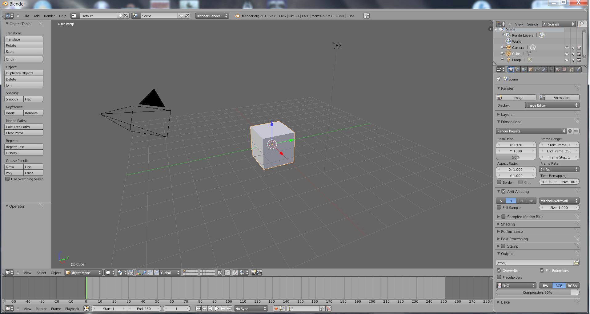 (Takto vypadá Blender 3D hned po spuštění. Časová osa (dole), Propriety (vpravo).)