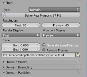 Základní scéna se skládá z ohraničení (domain), ve kterém se bude simulace počítat, a z kapaliny (fluid), ale můžete přidat i další objekty. Pokud chcete, aby tekutina něco obtékala, musíte použít obtékání (obstacle). Pro vytváření scenérií nikdy nestačí pouze voda z prvního objektu. Proto se používají objekty přitékání (inflow) a odtékání (outflow), kterými se jakoby vytvoří přítok a odtok vody, což může být třeba hadice a jímka. Pro reálnější vzhled můžete přidat tříštivost vody, která zajistí tvoření malých kapek. Jako u všech simulátorů je i zde možnost nastavit mnoho vlastností, jako třeba viskozita tekutiny, rychlost, rozlišení (nejčastěji 50-100) atd.. Aby ale kapalina vypadala reálně, je nutno si ještě pohrát s materiálem (viz materiály).