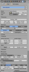 Particles neboli částicové systémy jsou jedny z nejužitečnějších efektů, kterými Blender disponuje. Ačkoliv by se to zdálo logické, nepatří mezi ostatní simulátory, ale je kapitolkou samou o sobě. Základem je systém tvoření prázdných bodů přiřazených jakémukoliv objektu. Body, částice se tvoří na povrchu, ve vertexech nebo v objemu objektu. Díky dalším nastavením mohou mít určitou počáteční rychlost, směr rotace, dobu trvání nebo velikost. Taky lze nastavit v jaké časovém úseku se mají body tvořit, stejně jako jejich množství. Samotné body ale na renderu nejsou vidět, proto těmto bodům přidáváme plochy, objekty nebo skupiny. Plochy jsou vlastně čtverce, kterým můžeme přidat třeba poloprůhlednou texturu. Využívá se toho při tvorbě jednoduchého kouře, ohně nebo prachu. Výhodou tohoto méně pěkného řešení je, že ho lze použít ve hrách nebo při vzdálených scénách, kde není třeba vysoké kvality zpracování. Užití objektů a skupin je stejné, ale skupiny umožňují emitovat (tvořit) více různých objektů najednou. Použití této funkce je asi zjevné. Já ji používám k vytváření explozí, výbuchů, sypajících se věcí nebo pro náhodné plnění prostoru nějakými objekty.