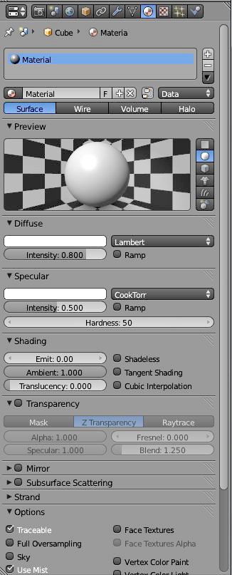 Každý materiál můžeme popisovat pomocí několika základních složek. Tyto složky se objevují i v texturách, které tak dotvářejí celkový vzhled modelu. Barva (Difuze) je základní vlastnost, se kterou by neměl být problém. Uvědomte si, že svět, ačkoliv se tak jeví, není až tak barevný, proto je lepší volit méně křiklavé barvy. Další důležitou složkou je lesklost (Specular). Ponecháváme vyšší hodnoty, pokud vytváříme vlhké prostředí nebo tvory, kteří jsou slizcí. Nižší hodnoty necháváme u textilií, pěn, čistého dřeva a podobně. Pokud chceme, aby objekt neměl stíny, nebo aby svítil, budeme nastavovat hodnoty ve Shading (stínování). Další materiálové funkce jsou kapitolkami samy o sobě.