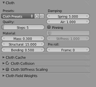Simulace textilu je velice působivá a často užívaná, protože vám umožní vytvořit ve scéně naprosto realisticky vytvarovanou látku. Například ji můžete použít v animaci třeba ke ztvárnění vlajky ve vichru. Můžete nastavit kvalitu výpočtů, pružnost, tažnost, efekt odporu vzduchu a další hodnoty. Zkusmo vytvořte objekt grid aspoň 20x20 bodů, přiřaďte tomuto objektu simulaci a pusťte výpočet (Alt+A). Vidíte, že váš objekt prostě spadne. Ale když do trajektorie vaší "hadry" vložíte jiný objekt, třeba krychli, a nastavíte mu kolizi (Physic/collizion), uvidíte co se stane teď. Uvedu pár mých postřehů. Snažte se vyhnout velikým simulacím s obrovským počtem vertexů, protože se tím značně navyšuje čas pro výpočet simulace. Můžete nastavit různé předvolené typy látek ( kůže, hedvábí atd.) nebo si vytvořit svůj požadovaný materiál. Důležitá je kolize látky samotné a její kvalita, kterou můžete nastavit.