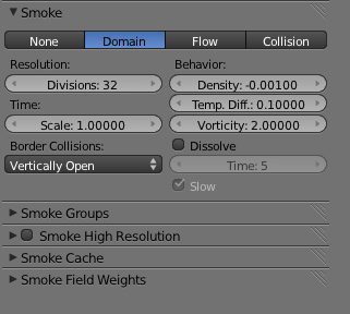 Kouřové simulace patří mezi náročnější simulace. Pomocí ní lze vytvářet velmi realistické kouřové efekty. Základem je Domain (místo) a Flow (objekt který kouří). Musím se přiznat, že udělat tuto simulaci funkční je velice složité, už pro obrovské množství kroků, které je potřeba udělat.